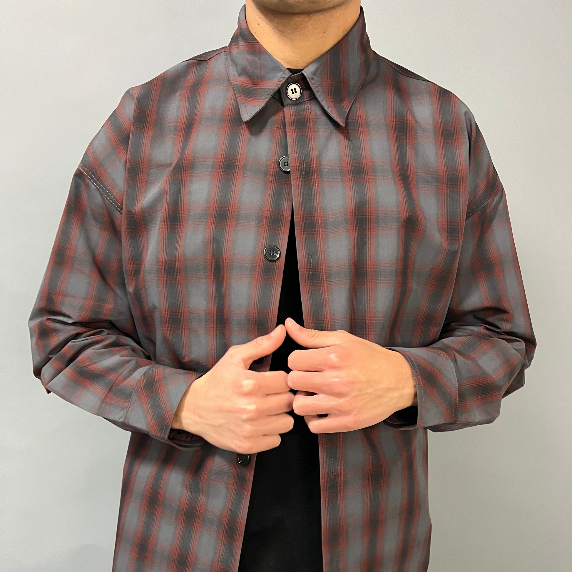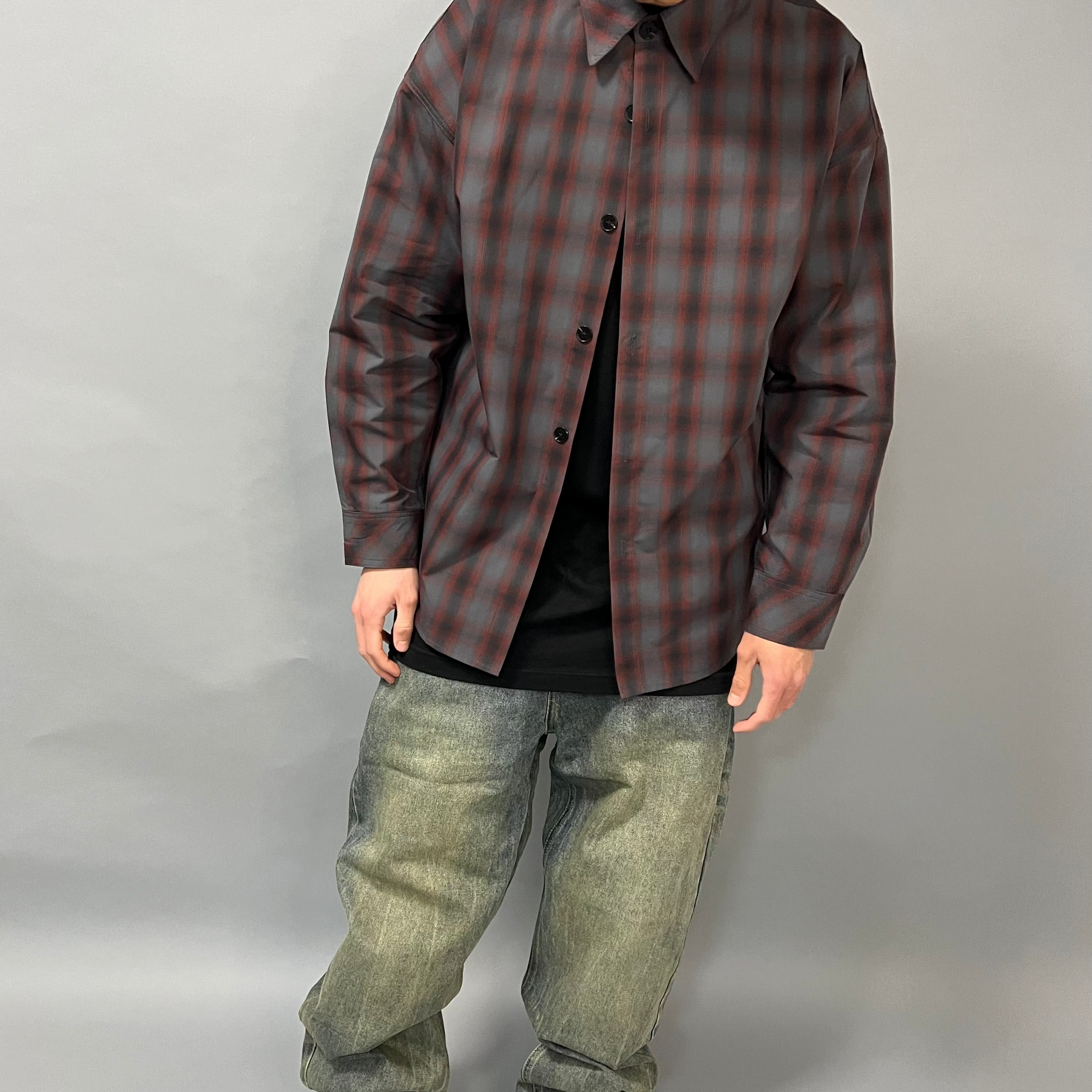 La fantasia quadri dark con base nera e sfumature grigio/rosso crea un effetto elegante ma urban. Il fit oversize strutturato garantisce una caduta perfetta, mantenendo volume senza perdere proporzione.
