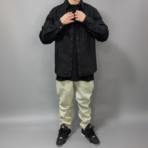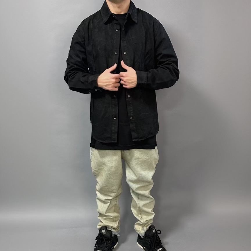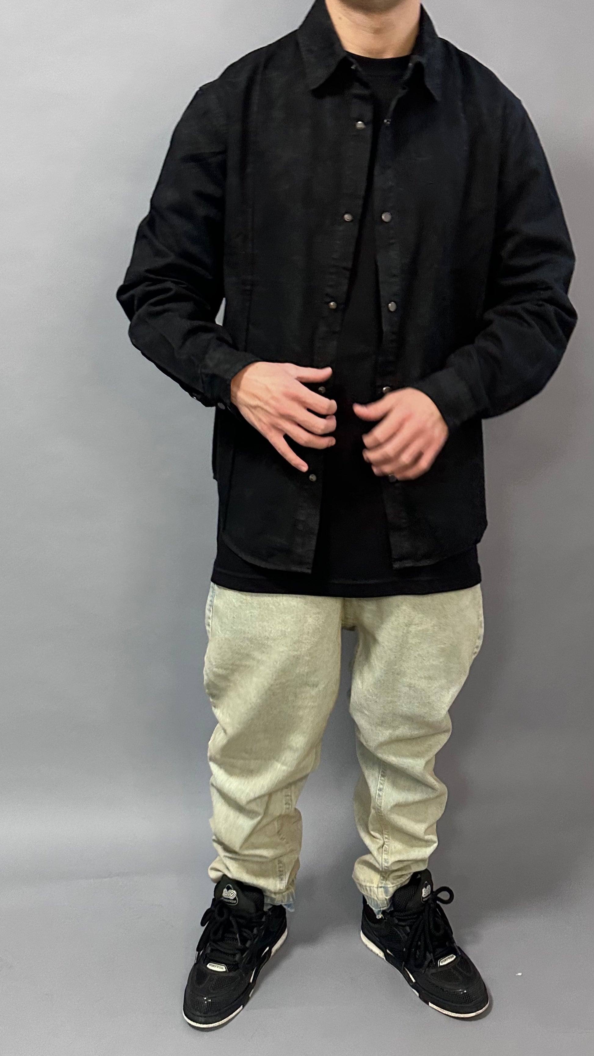 Camicia over di jeans nera con leggere sfumature e chiusura a bottoni.