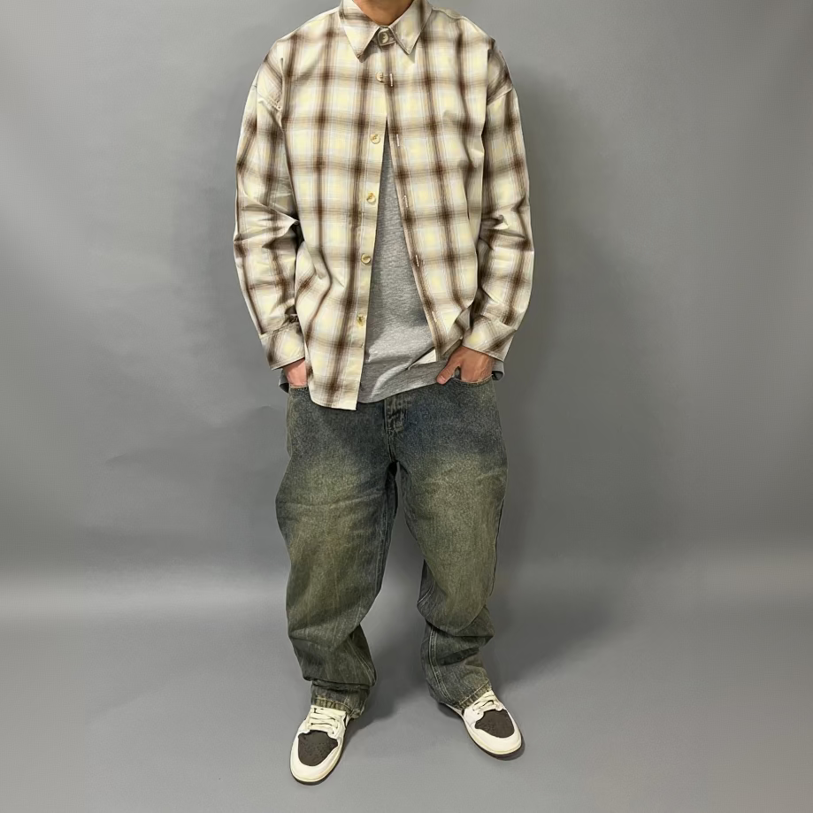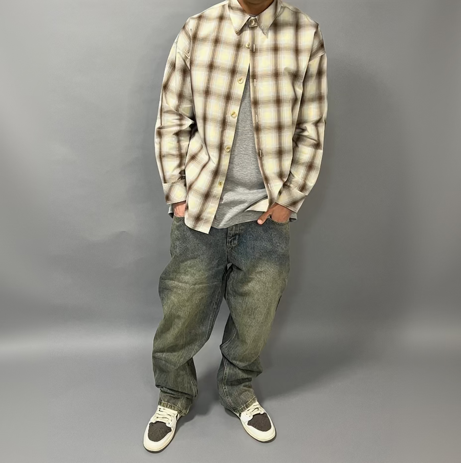Realizzata con vestibilità oversize strutturata, questa camicia a quadri beige con tonalità marroni è pensata per essere indossata aperta sopra una t-shirt oppure chiusa per un look più pulito e minimal.